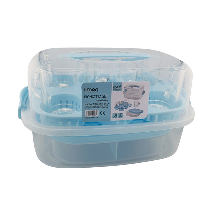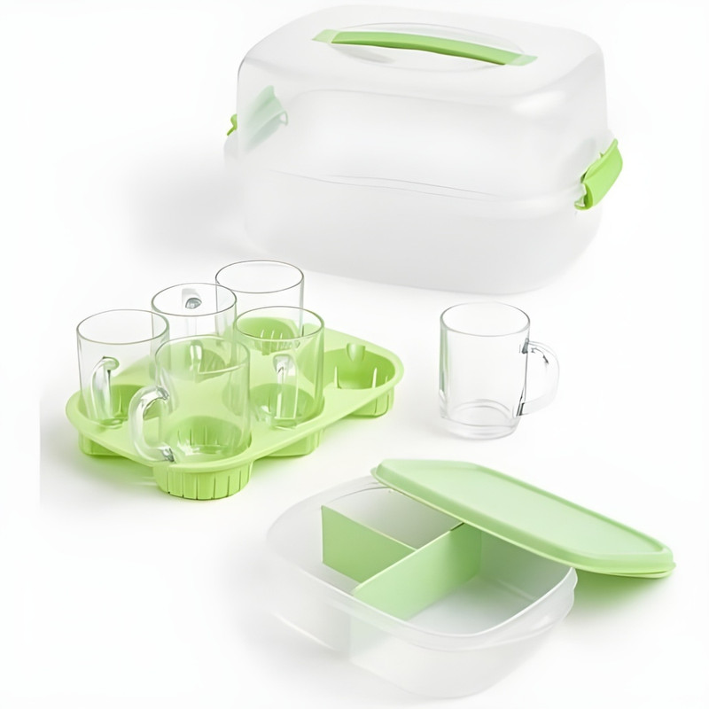 اقلام داخل بسته : 6 عدد لیوان شیشه ای دسته دار + سینی سرو + نظم دهنده 3 قسمته + باکس حمل / کاربرد :پیکنیک، سفر، محل کار
